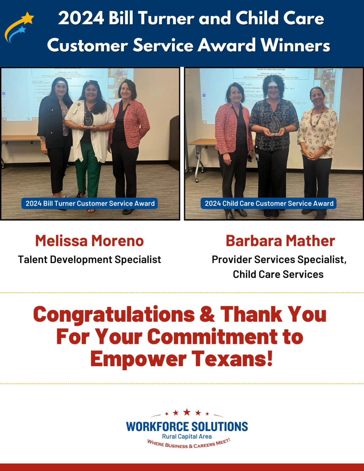 Workforce Solutions Rural Capital Area (WSRCA) is pleased to announce the recipients of the 2024 Bill Turner Customer Service Award and the Childcare Customer Service Award. This year, we recognize Melissa Moreno and Barbara Mather for their outstanding dedication and exceptional service to our customers.
