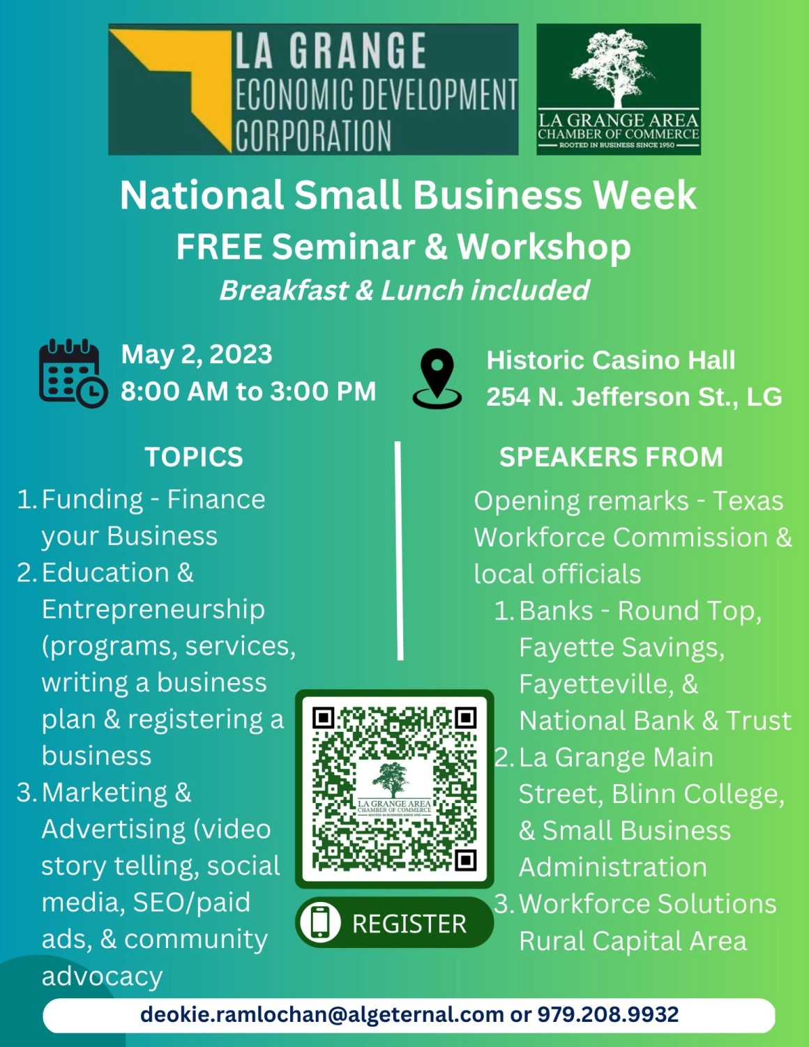 Join us on May 2, 2023, from 8 a.m. to 3 p.m., as we partner with the La Grange Economic Development Corporation and the La Grange Area Chamber of Commerce to host the first annual La Grange National Small Business Week Seminar & Workshop.