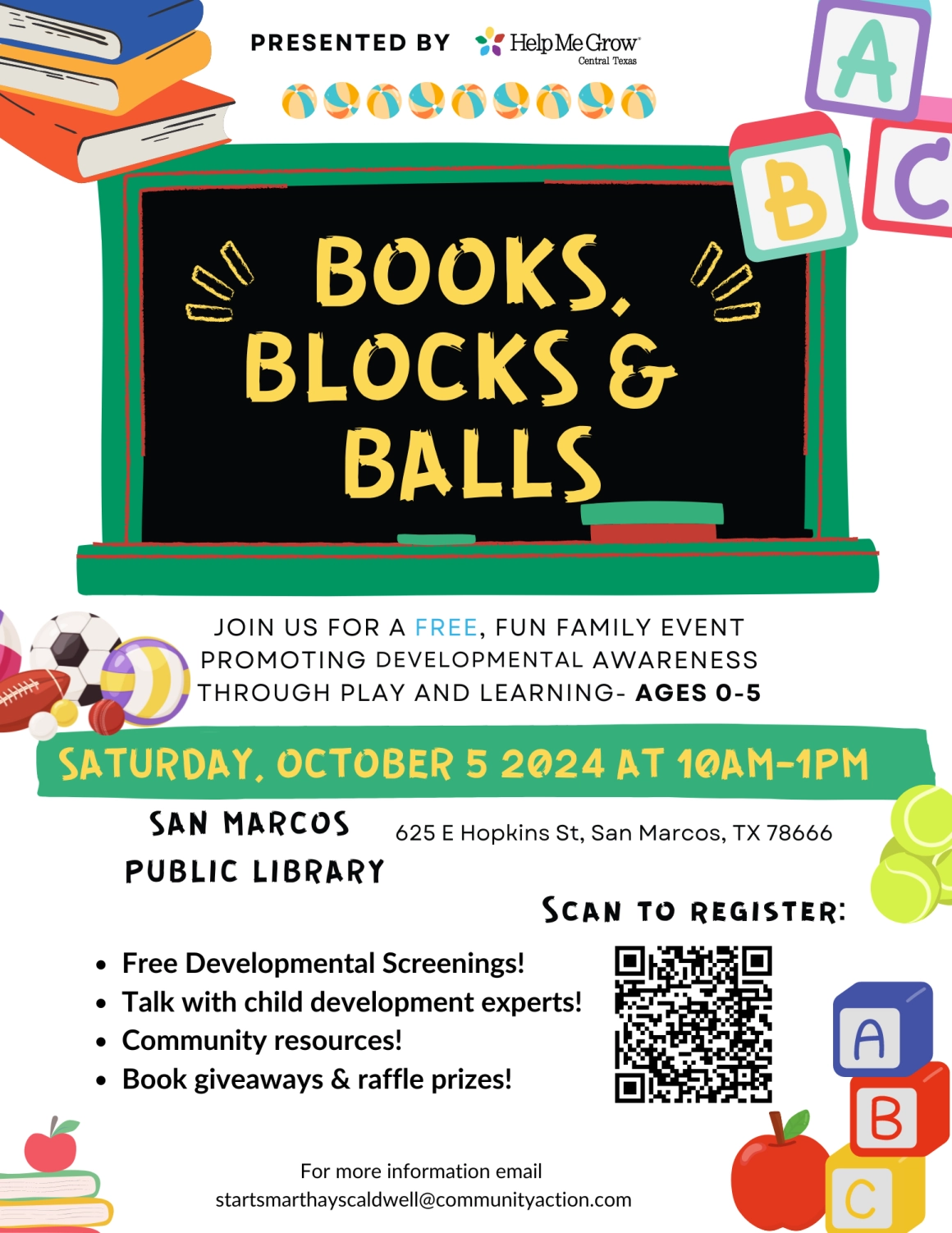 Ready to join the fun? Register now for the Hays County event here: Books, Blocks & Balls Event Registration.