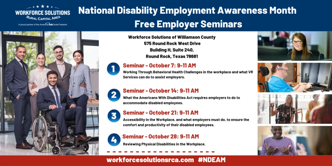 Texas Workforce Solutions-Vocational Rehabilitation Services (VR) and Workforce Solutions Rural Capital Area (WSRCA) are celebrating National Disability Employment Awareness Month (NDEAM) this October by holding free weekly seminars for employers at the Workforce Solutions of Williamson County career center in Round Rock.
