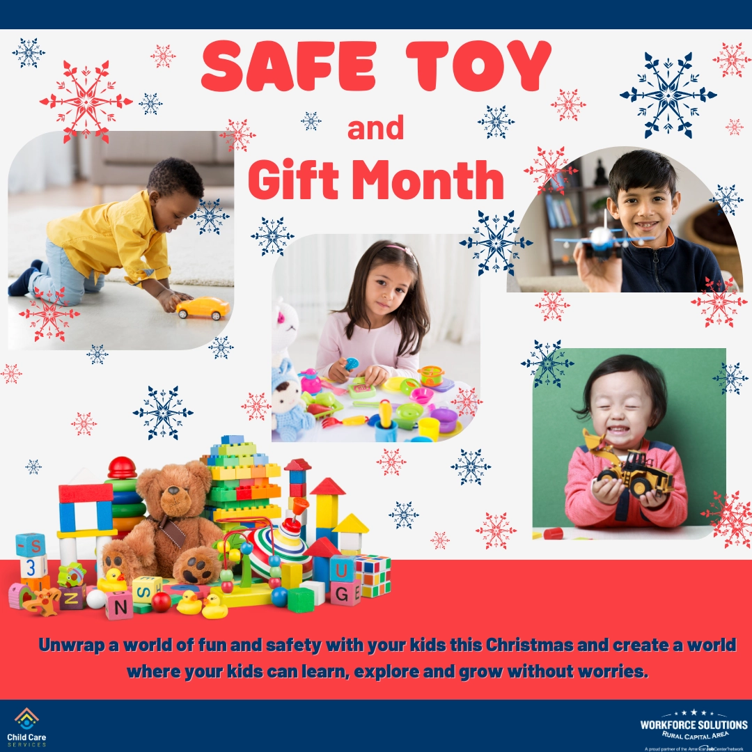 December is Safe Toy and Gift Month. Workforce Solutions Rural Capital Area would like to help tear open the ultimate guide on how to pick out the coolest, trendiest, and safest toys for your little kiddos because safety is always the best way to glam up your gift game!