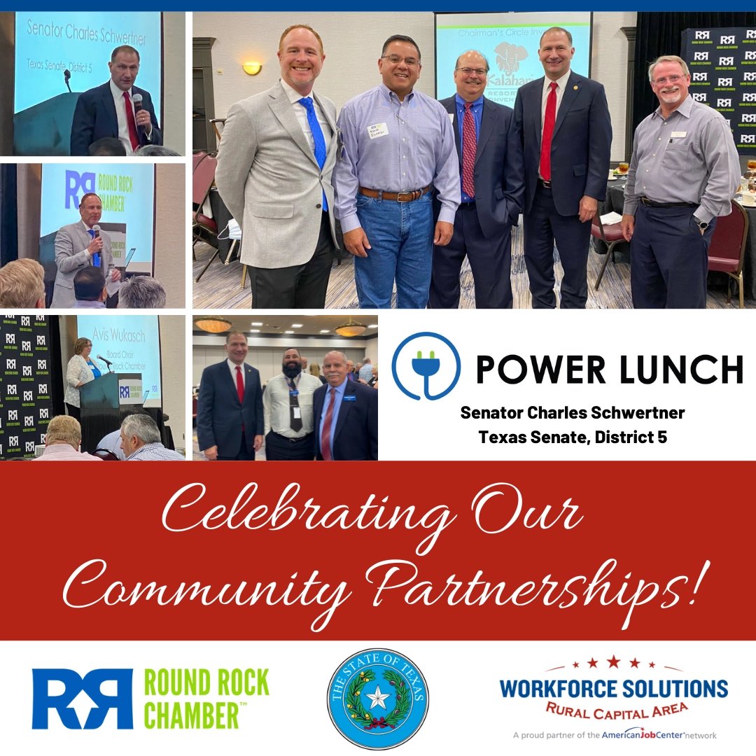 The Workforce Solutions Rural Capital Area team is honored to have taken part in the Round Rock Chamber's Power Lunch, which featured Sen. Charles Schwertner, Texas Senate, District 5, who provided an update on the 87th Texas Legislative Session.