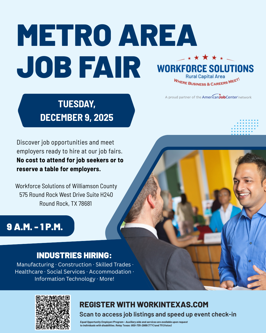 Head to our Workforce Solutions of Williamson County location in Round Rock on the second Tuesday each month for a hiring event featuring employers from a wide range of industries.