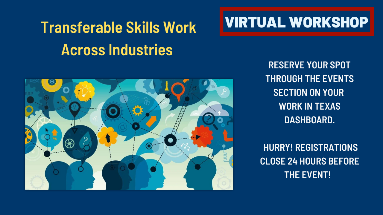 To register for the workshop: Sign-in to www.workintexas.com > My Dashboard > Current Month's Events > Find the session you wish to attend.
