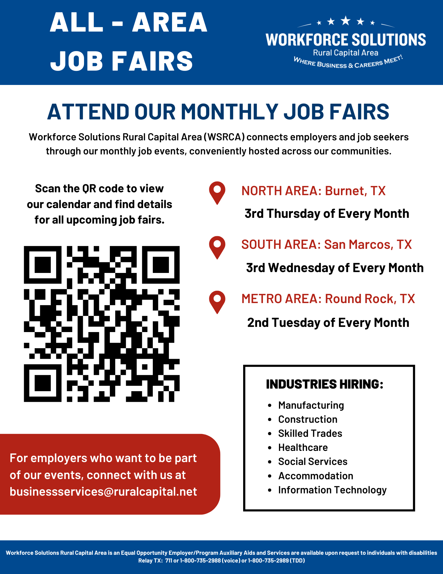 EAST AREA COMMUNITY: Join one of the three area fairs happening each month: North Area in Burnet, South Area in San Marcos and Metro Area in Round Rock.