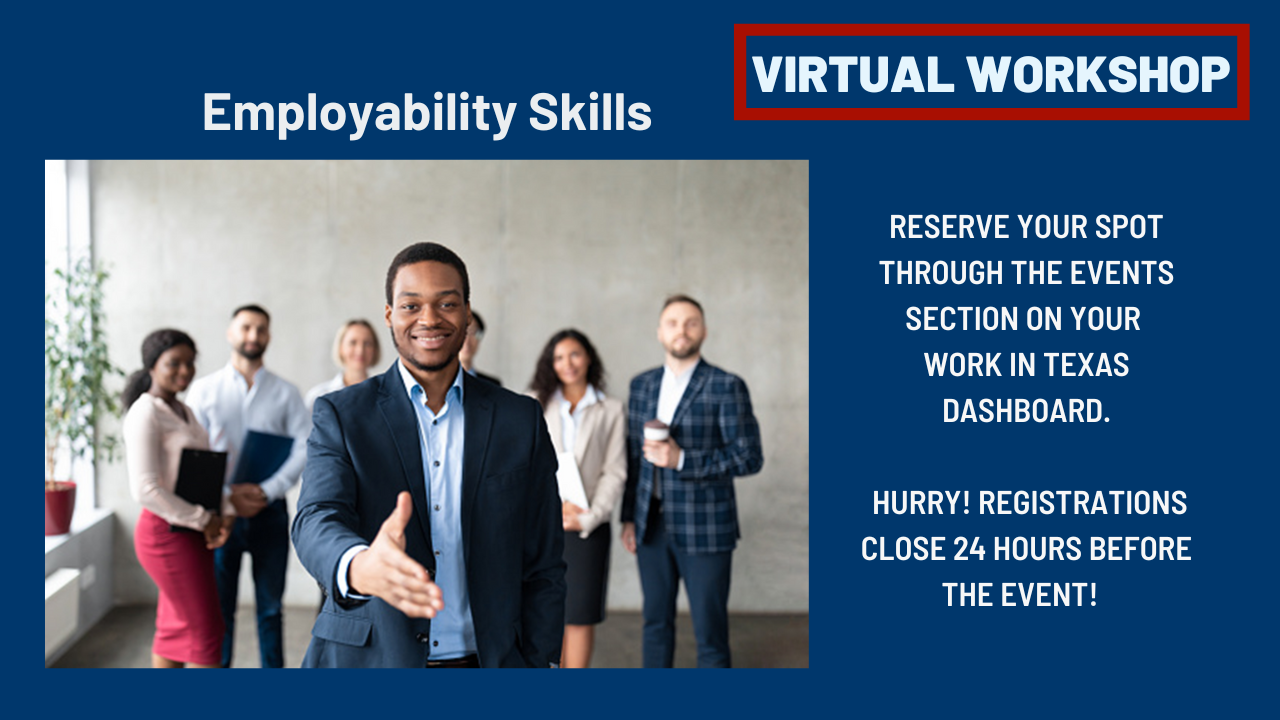 To register for the workshop: Sign-in to www.workintexas.com > My Dashboard > Current Month's Events > Find the session you wish to attend.