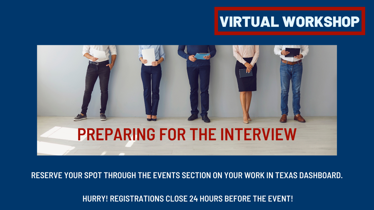 To register for the workshop: Sign-in to www.workintexas.com > My Dashboard > Current Month's Events > Find the session you wish to attend.