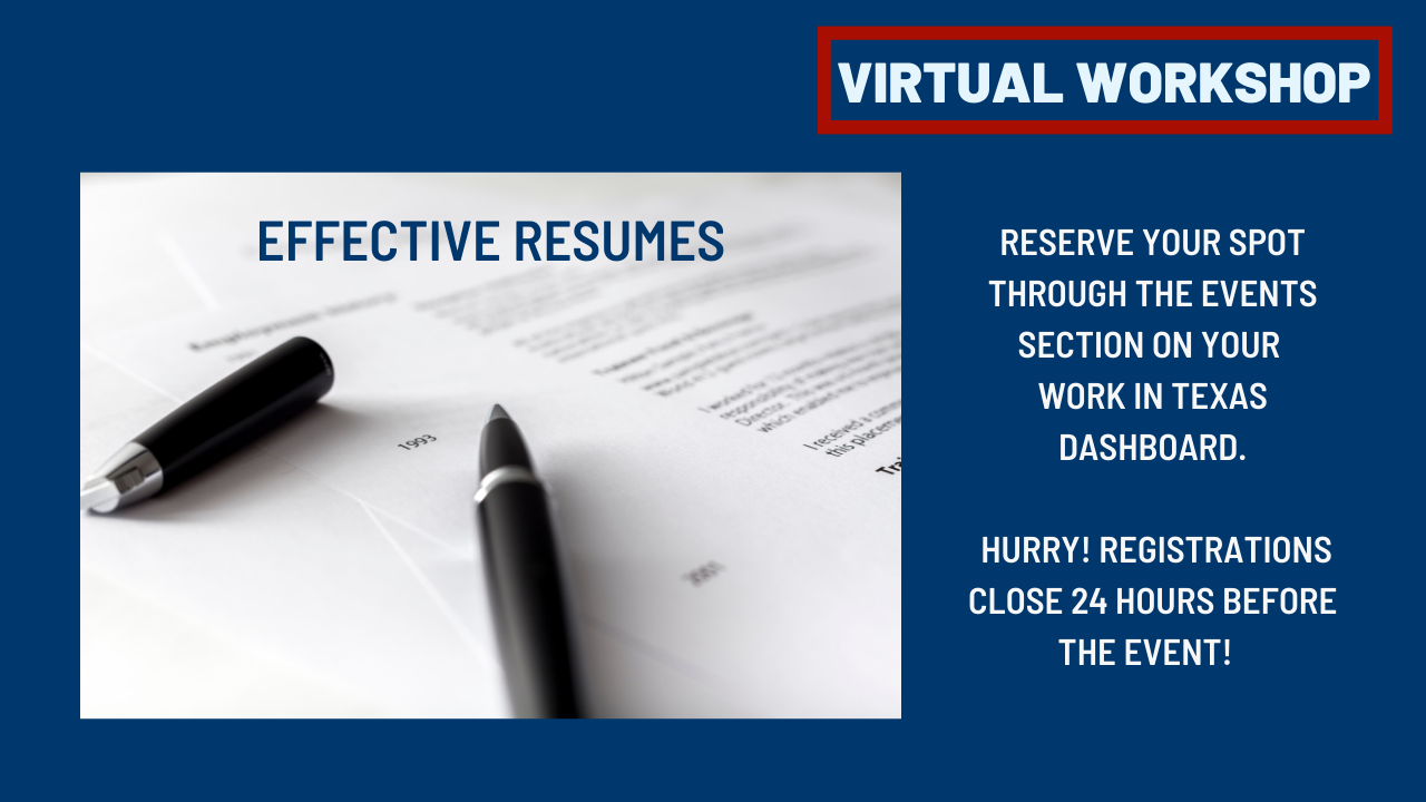 To register for the workshop: Sign-in to www.workintexas.com > My Dashboard > Current Month's Events > Find the session you wish to attend.