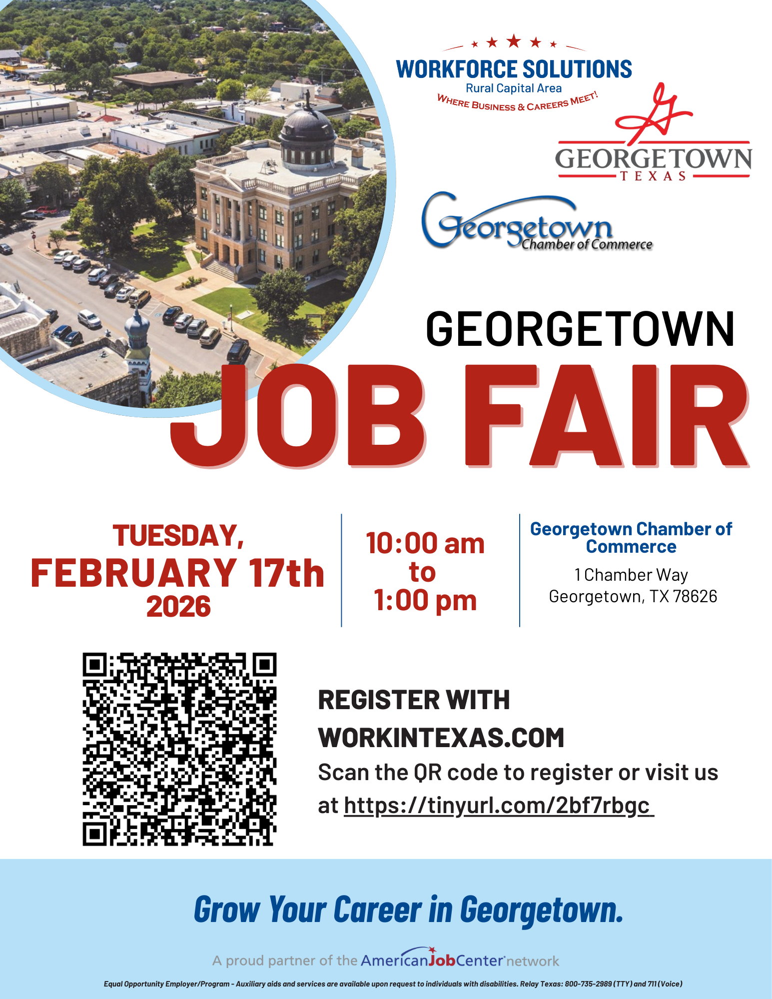Join us for the Georgetown Job Fair on Tuesday, February 17, 2026, from 10:00 a.m. to 1:00 p.m. at the Georgetown Chamber of Commerce.