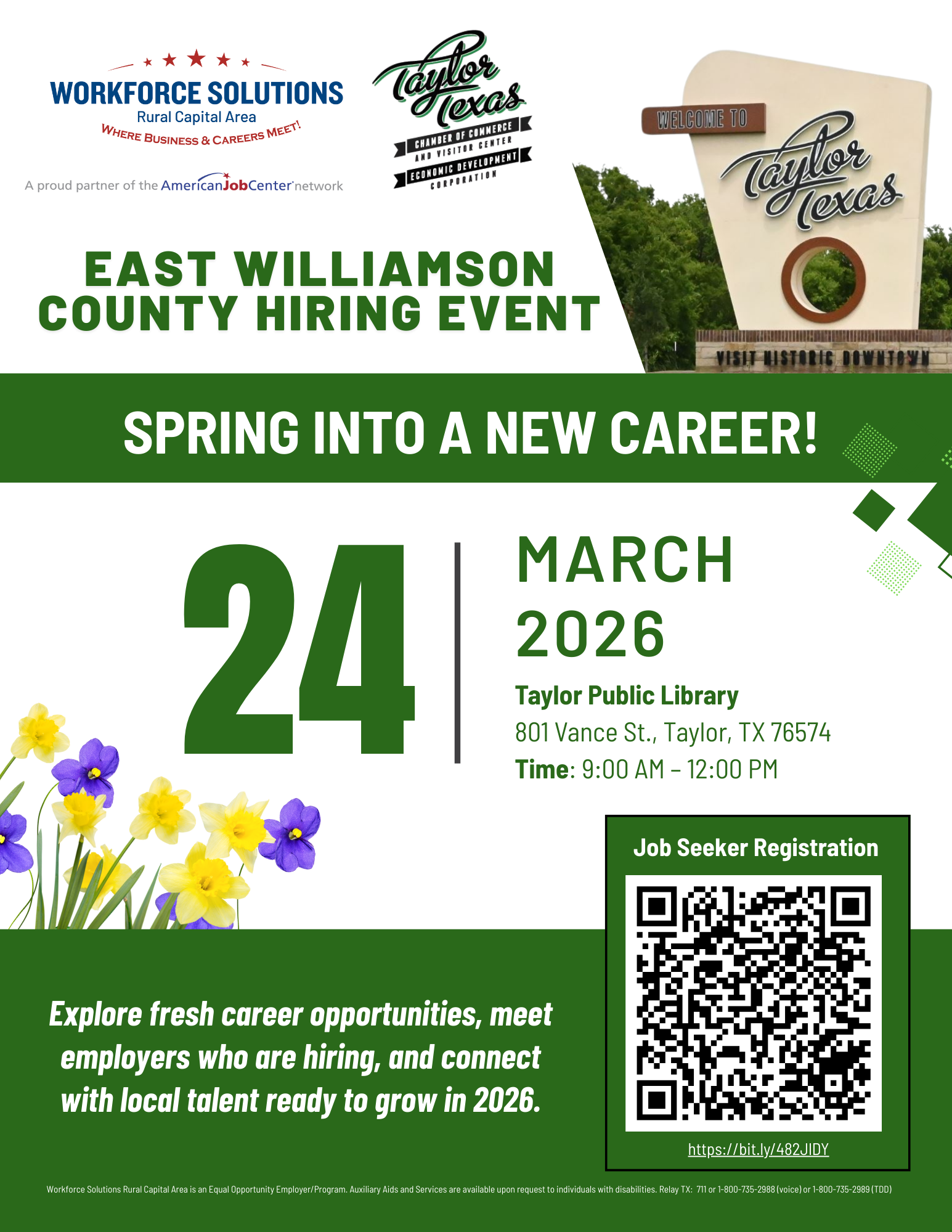 This event is presented in partnership with Workforce Solutions Rural Capital Area, the Taylor Chamber of Commerce, and the Taylor Economic Development Corporation.