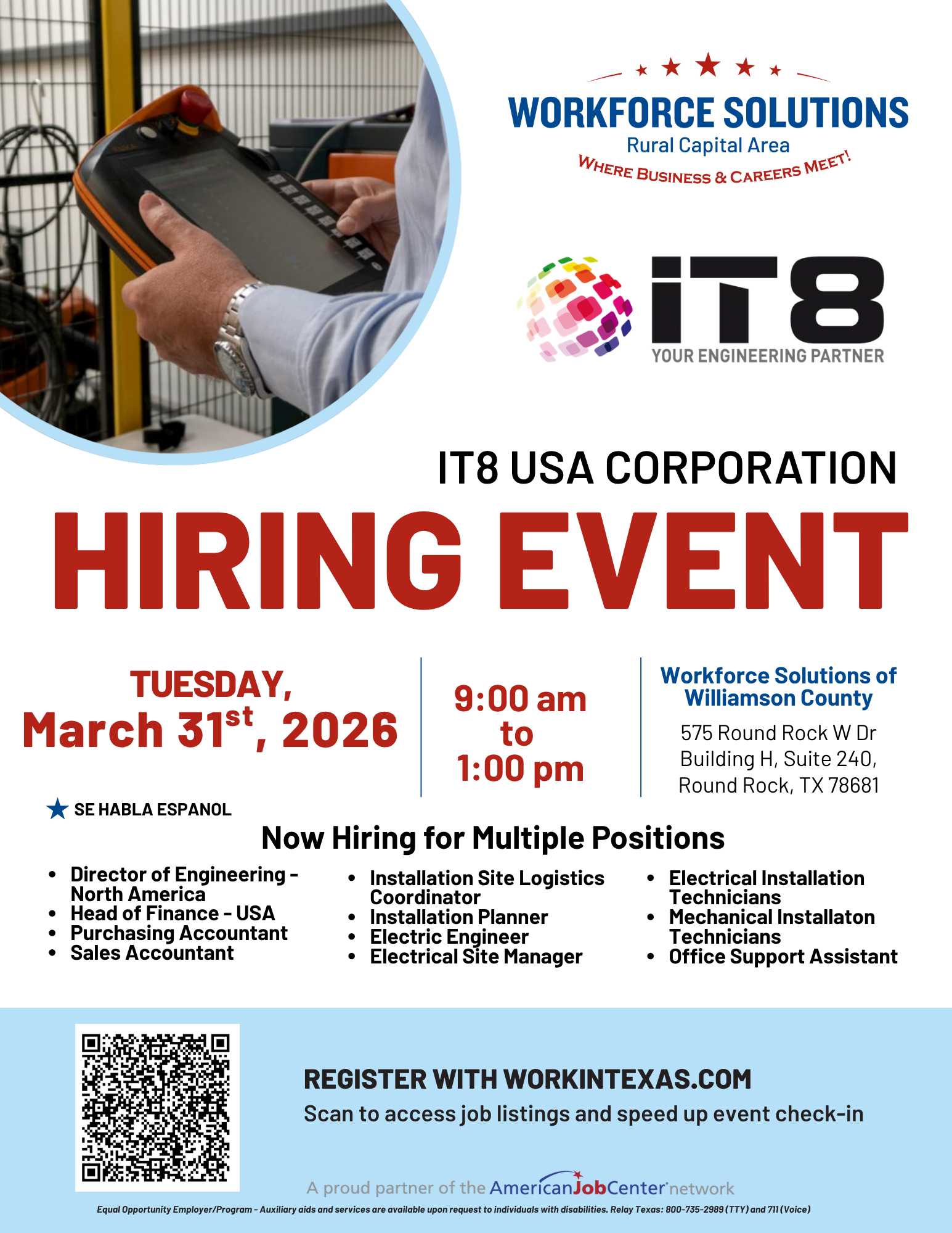 Workforce Solutions of Williamson County invites job seekers to attend a hiring event with IT8 USA Corporation, a leading company seeking qualified candidates for multiple roles across North America.