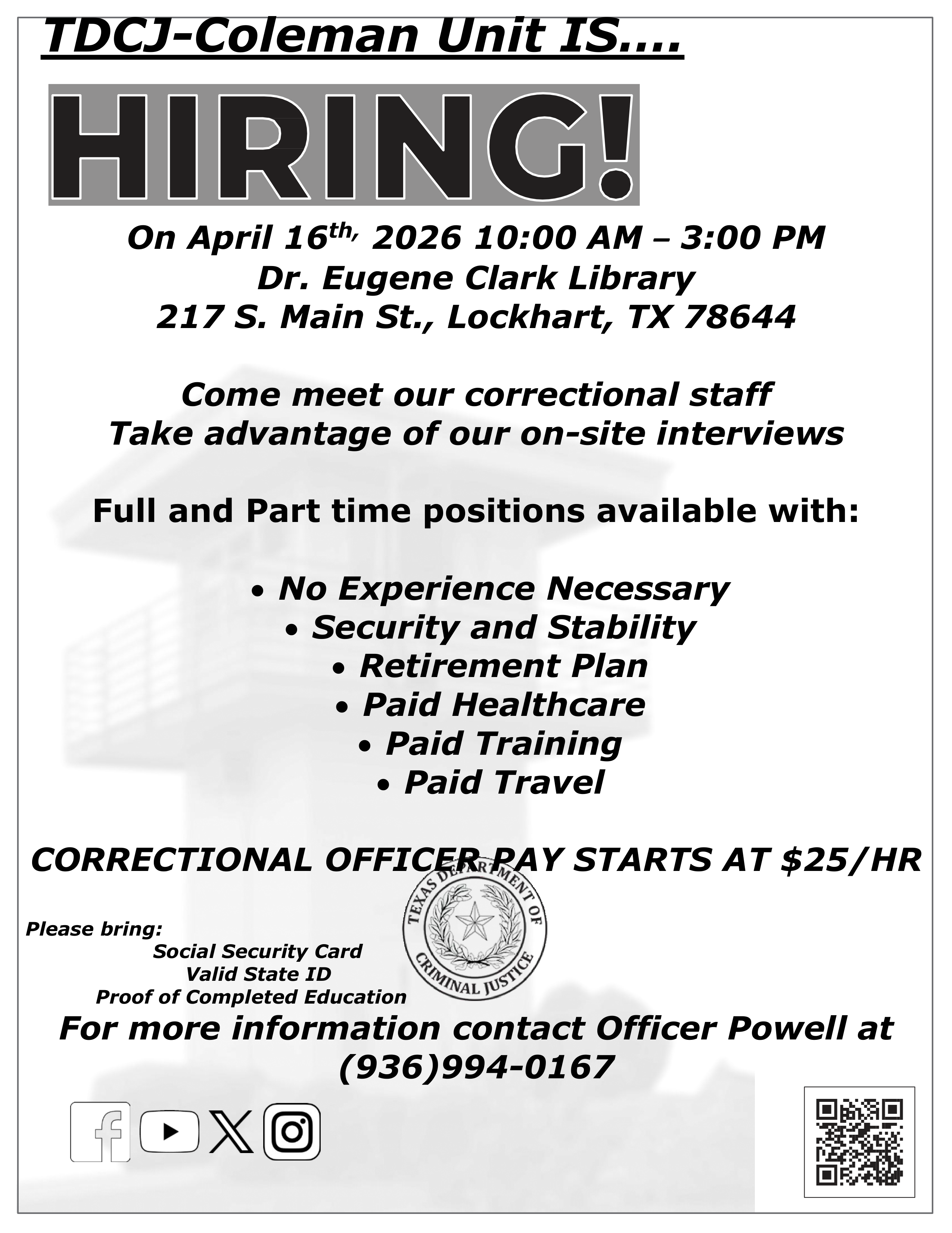 The TDCJ Coleman Unit is hosting a hiring event on April 16, 2026, from 10:00 AM to 3:00 PM at the Dr. Eugene Clark Library in Lockhart.