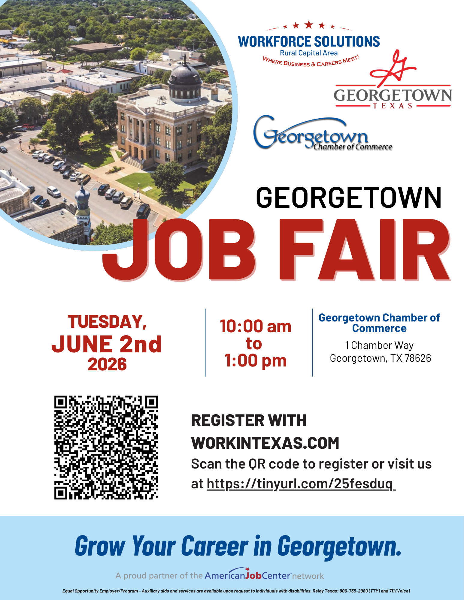 Join us for the Georgetown Job Fair on Tuesday, June 2, 2026, from 10:00 a.m. to 1:00 p.m. at the Georgetown Chamber of Commerce.