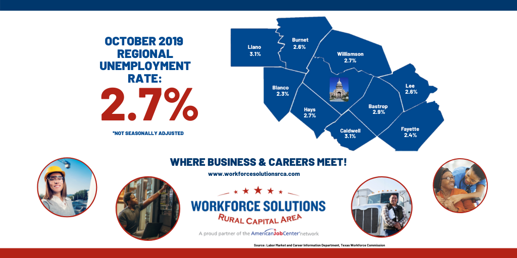 CEDAR PARK, Texas ⎯ The unemployment rate in the Rural Capital Area of Central Texas fell for the third consecutive month, dropping from 2.8 percent* in September, down to 2.7 percent in October, with 4,576 jobs added, according to figures released today by the Texas Workforce Commission (TWC). The 2.7 percent unemployment rate represented 14,928 residents in the nine-county area seeking employment. The region’s unemployment rate remained below the Texas and national rates, which both were unchanged from September at 3.3 percent.