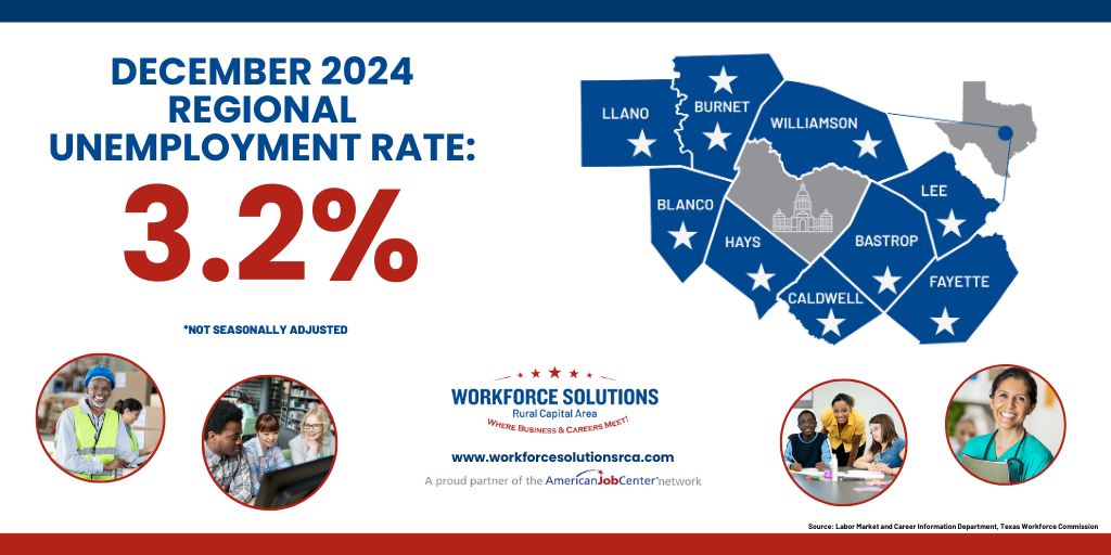 CEDAR PARK, Texas ⎯ In December 2024, the unadjusted unemployment rate in the Rural Capital Area of Central Texas decreased to 3.2 percent, according to data released by the Texas Workforce Commission (TWC). This means that 3.2 percent of the workforce in the nine-county Workforce Solutions Rural Capital Area (WSRCA) were actively seeking employment, totaling 21,773 residents. Additionally, there were more than 19,701 job openings available online across various industries*.