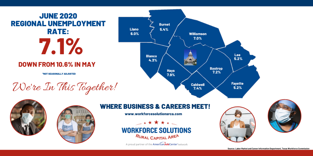 CEDAR PARK, Texas ⎯ The unadjusted unemployment rate in the Rural Capital Area of central Texas continues to trend down towards pre-COVID-19 levels, sliding to 7.1 percent in June 2020, down from 10.6 percent in May, according to figures released today by the Texas Workforce Commission (TWC). The 7.1 percent unemployment rate in the nine-county Workforce Solutions Rural Capital Area (WSRCA), represented 38,305 residents seeking employment; a decline of more than 31 percent from the month prior. The region’s unemployment rate remained below both the Texas (8.9 percent)* and national (11.2 percent)* rates.