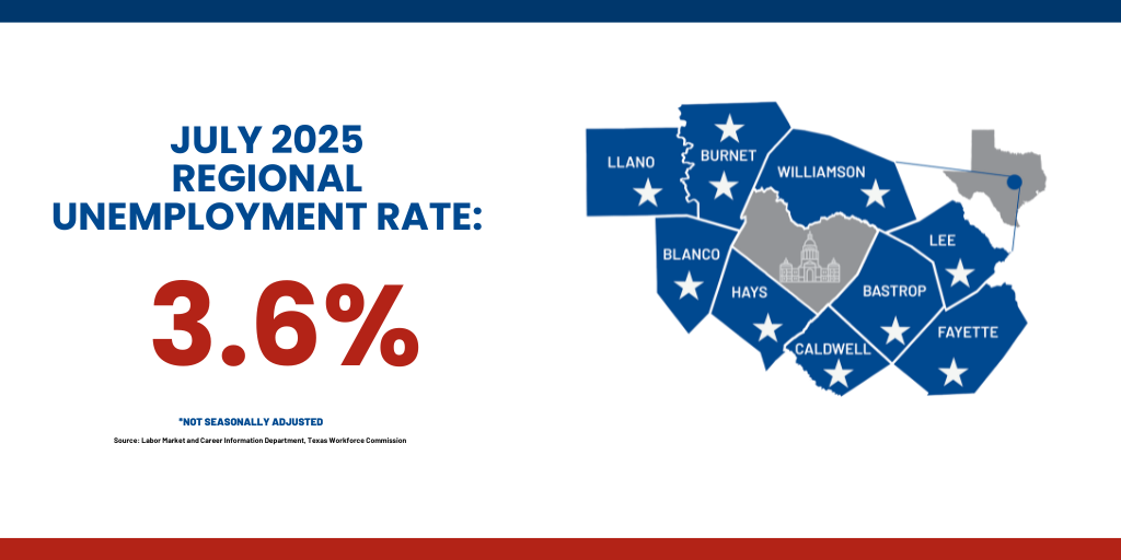 CEDAR PARK, Texas ⎯ In July 2025, the unadjusted unemployment rate in the Rural Capital Area of Central Texas increased to 3.6 percent, according to data released by the Texas Workforce Commission (TWC). This means that 3.6 percent of the workforce in the nine-county Workforce Solutions Rural Capital Area (WSRCA) were actively seeking employment, totaling 26,214 residents.