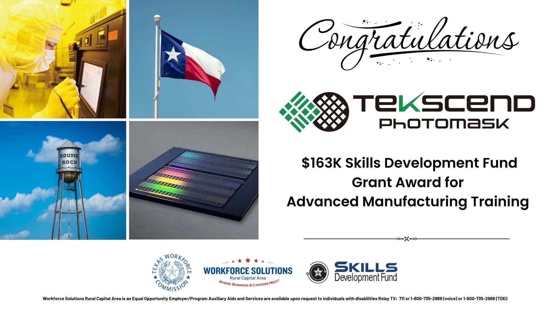 CEDAR PARK, Texas – The Texas Workforce Commission (TWC) has awarded a $163,388 Skills Development Fund grant to Workforce Solutions Rural Capital Area (WSRCA), in close collaboration with Tekscend Photomask, to expand advanced manufacturing training and strengthen workforce opportunities across Central Texas.